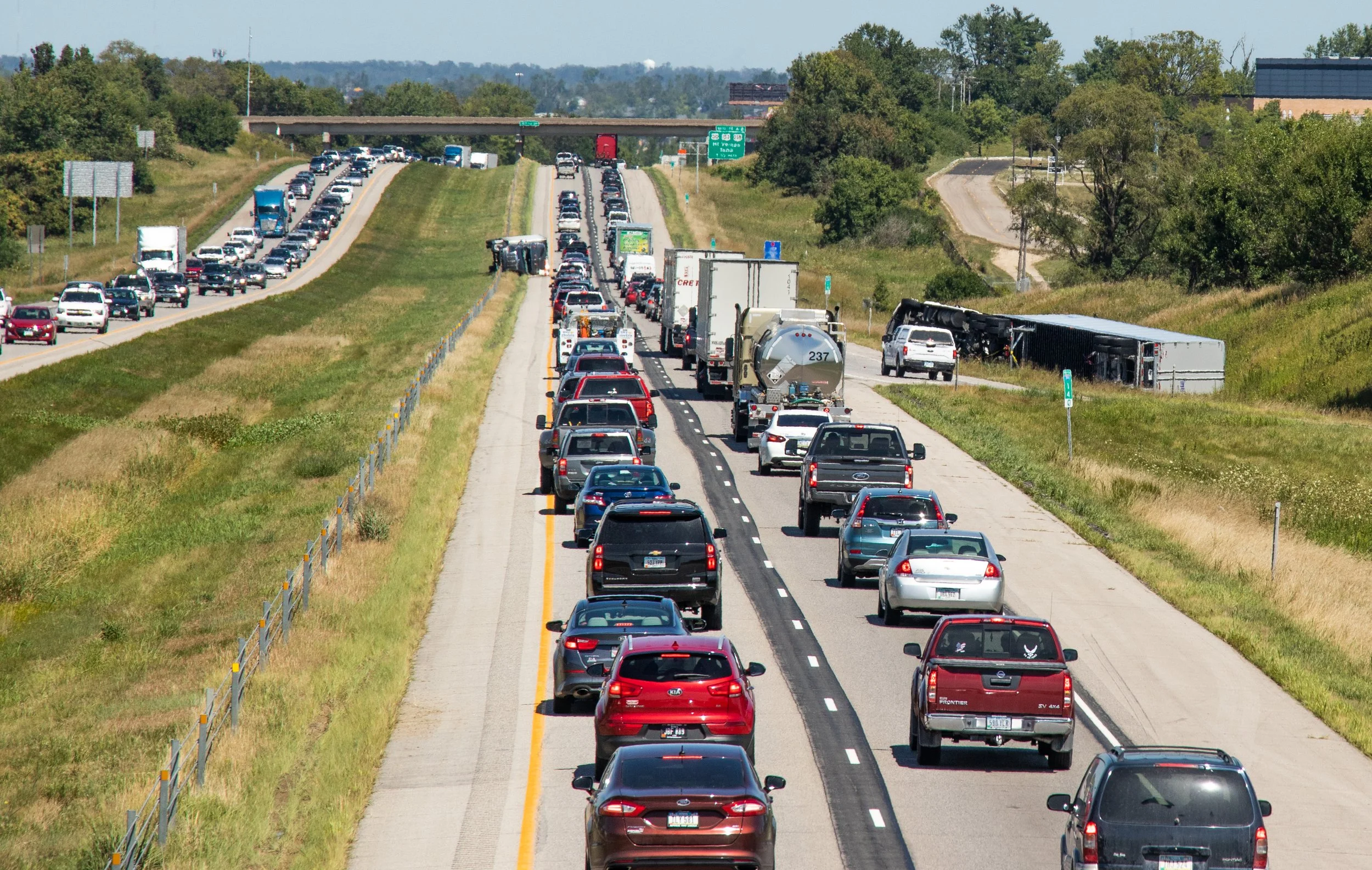 Traffic is at a standstill west of Cedar Rapids along US 30 due to high-tension lines over the highway. We were able to maneuver on the shoulder and under the lines while semis were stuck for hours.